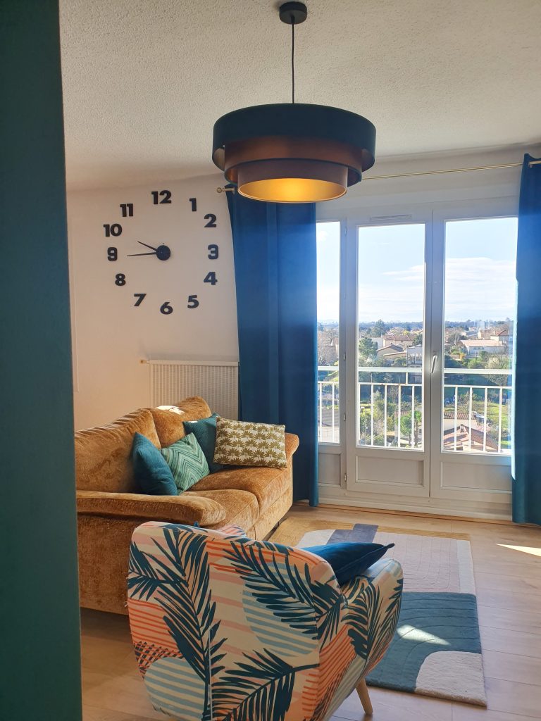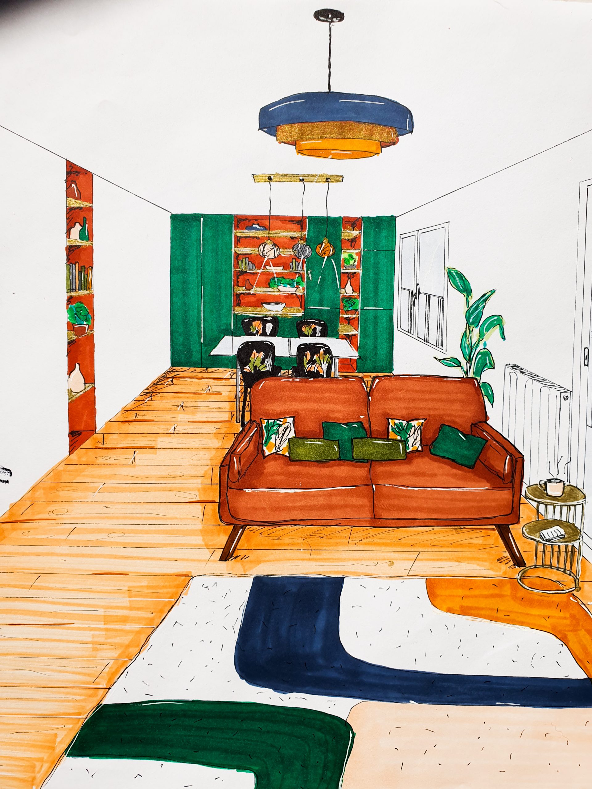 Une pièce à vivre colorée dans cet appartement repensé entièrement.