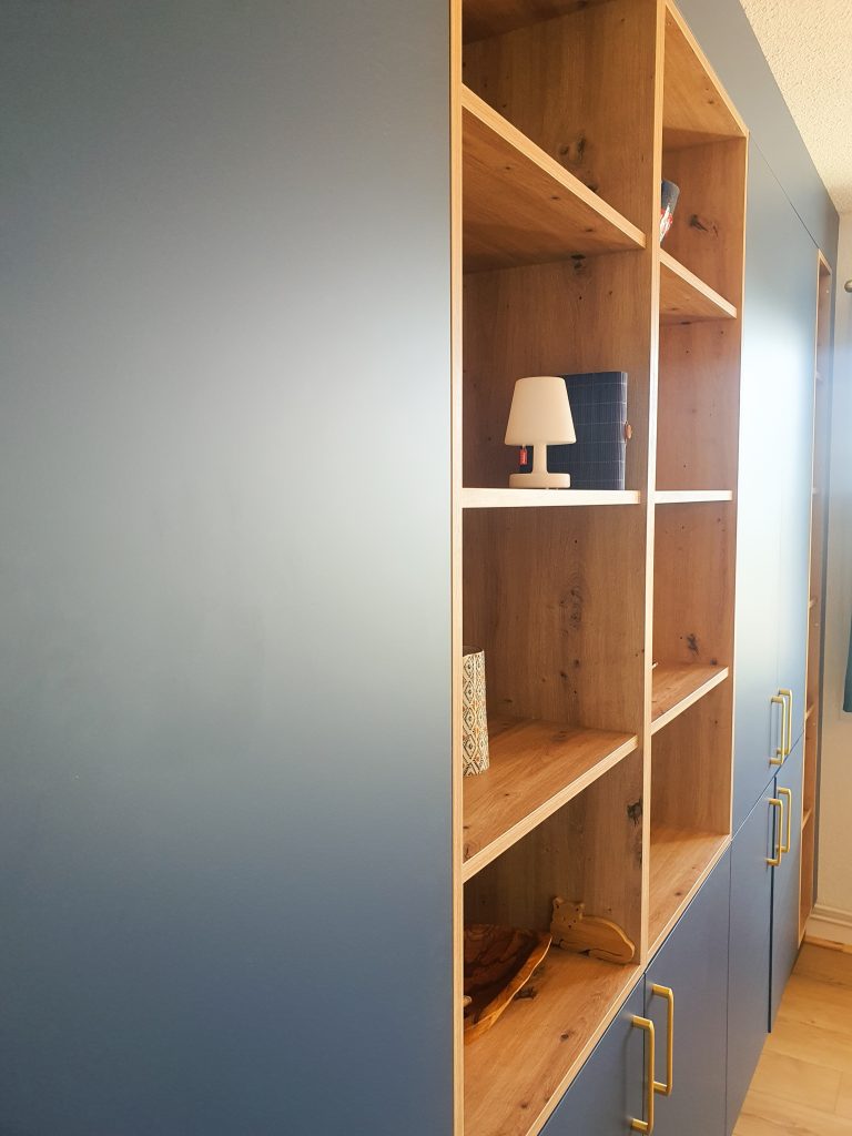 Un linéaire sur-mesure dessiné en fonction du besoin de rangement et réalisé par un artisan local.