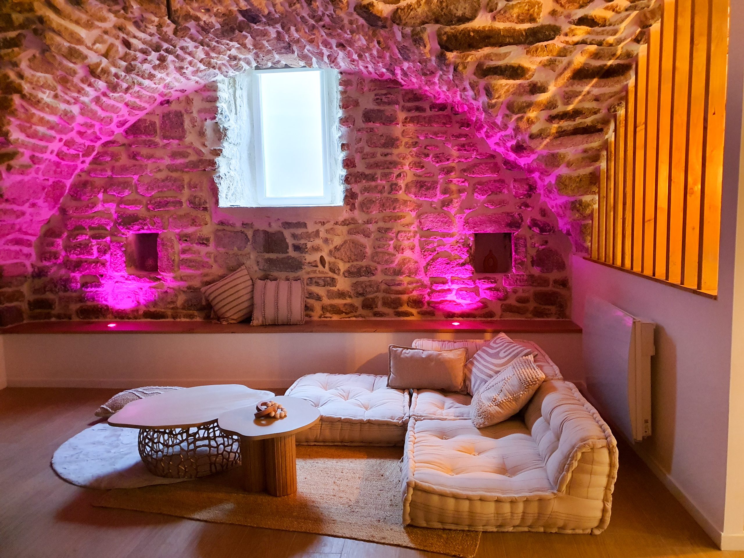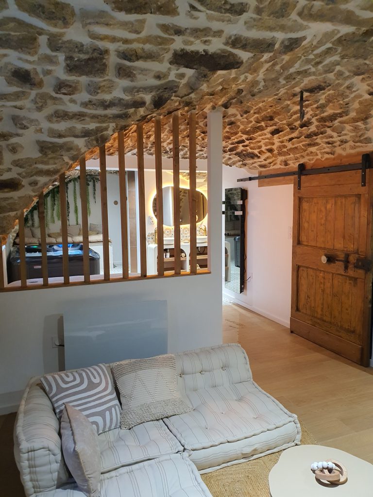 Une suite premium avec jacuzzi et sauna, qui mêle authenticité, bien-être et décoration accessible : Ici, tout a été pensé pour faire de cette ancienne cave voûtée , un véritable lieu de détente. De l’agencement à la décoration en passant par les détails pratiques, tout est fait pour que les locataires se sentent bien et profitent de chaque instant sans contraintes.