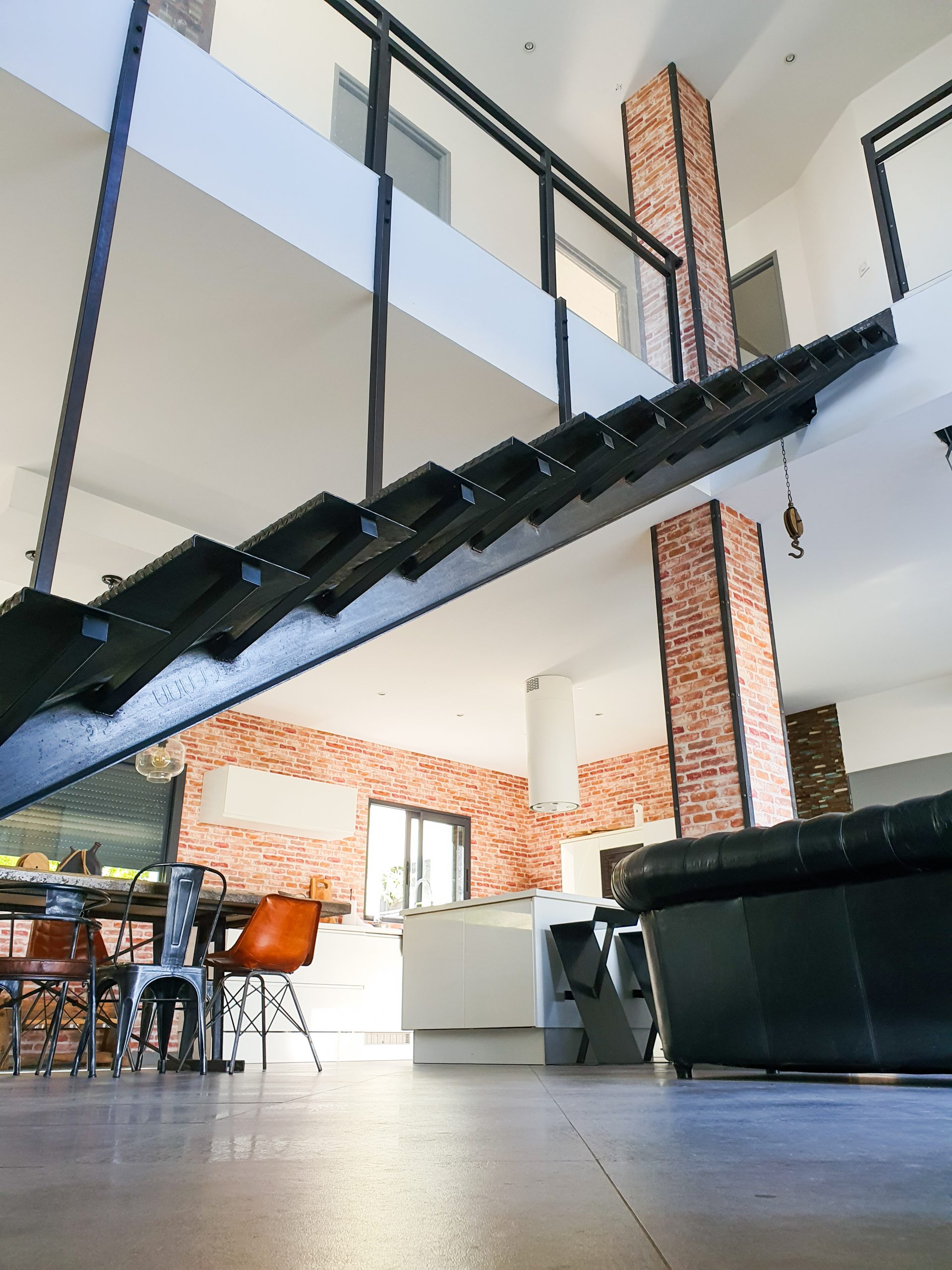 Mon conseil ? trouver LE point de départ de votre ambiance. Comme ici avec cet escalier central en acier. L’harmonie devient ensuite plus facile à réaliser, et l’ambiance se tisse petit à petit au fil des différents meubles et décoration. Dans cette pièce (projet réalisé en 2016) chaque élément trouve sa place naturellement et vient contribuer à l’harmonie globale.