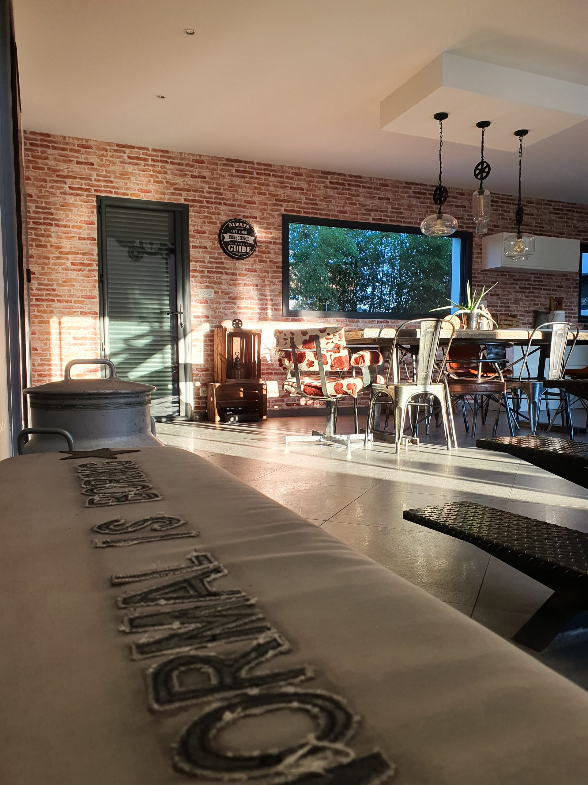 La présence de l’acier qui se retrouve dans les tabourets et les portes de placard réalisées pour cette pièce.